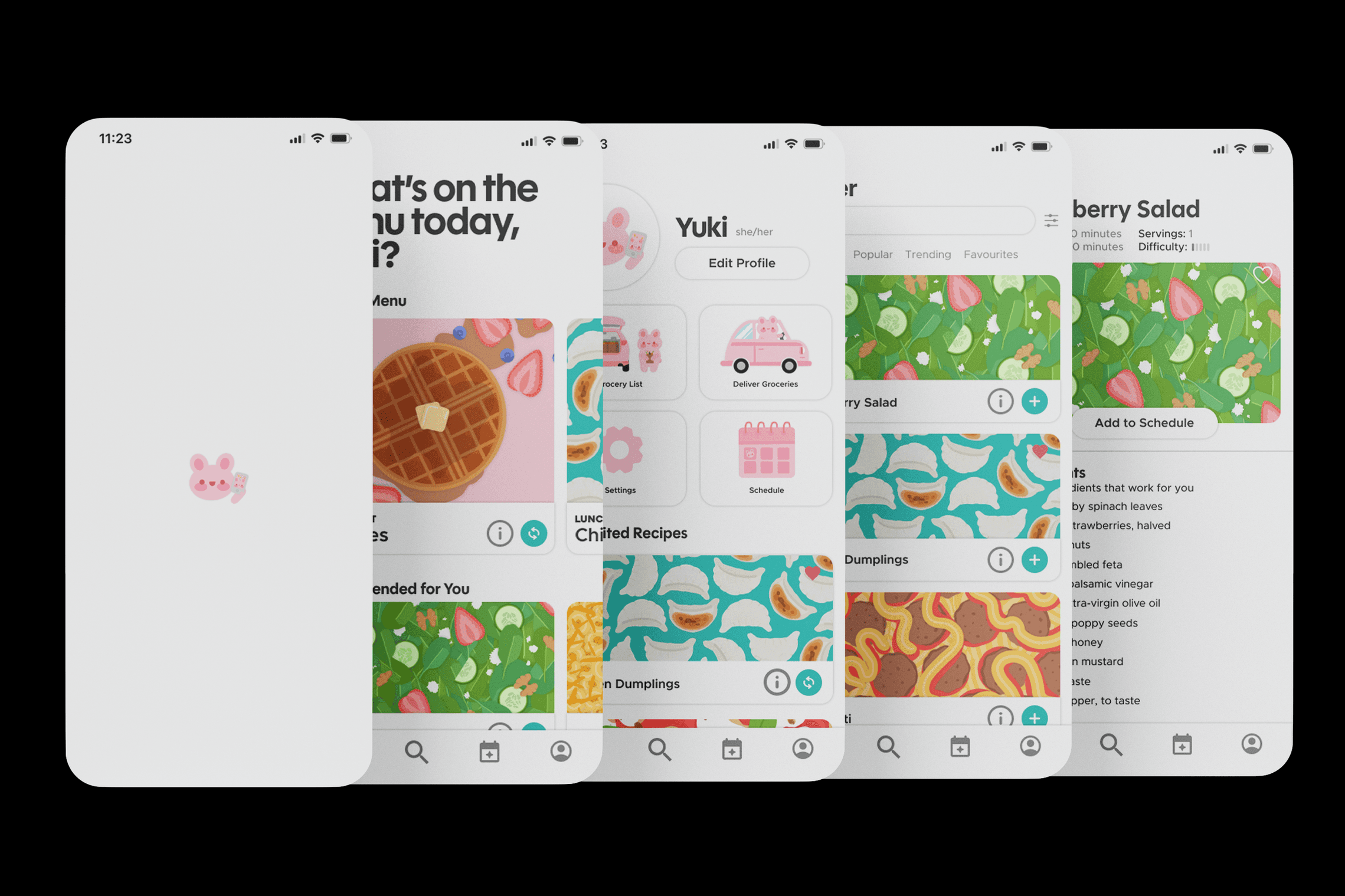 Digestible focuses on designing a meal planning app that reduces stress in everyday food decisions. The app enables users to plan meals, automatically generate precise ingredient lists, and order groceries for delivery within a single, streamlined experience. Miso, the bunny mascot is integrated as a guiding companion to support usability, onboarding, and engagement without distracting from core tasks.