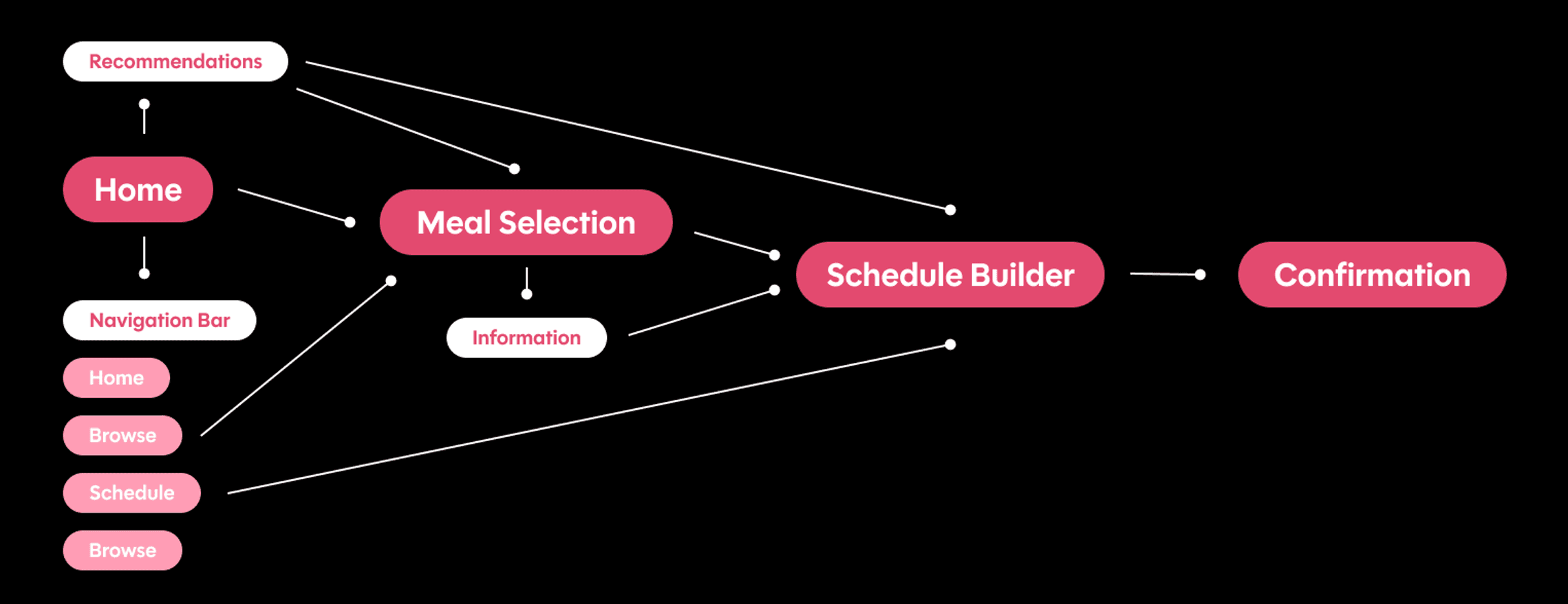 This user flow outlines how a user moves through the app to plan meals efficiently, from discovery to confirmation. The flow prioritizes clarity, flexibility, and low cognitive load, allowing users to explore options, build a schedule, and finalize their plan with confidence.